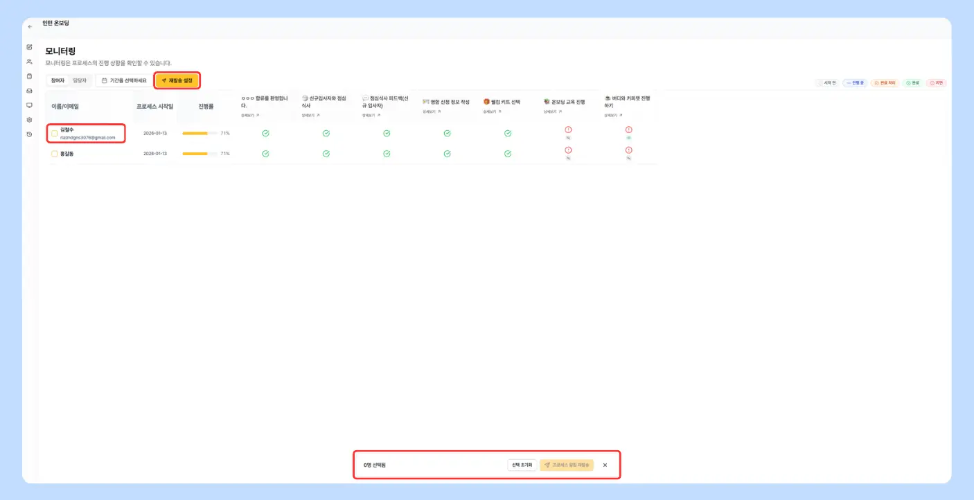모니터링 권한: 전체 진행 상황을 관제하고 운영 흐름을 관리할 수 있는 관리자 권한입니다.
