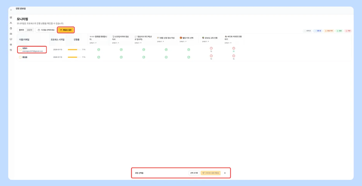 알림 재발송: 응답이 늦어지는 담당자에게 클릭 한 번으로 리마인드 알림을 다시 보낼 수 있어, 일일이 연락해야 하는 수고를 덜어줍니다.