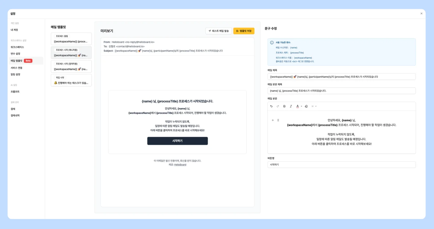 워크스페이스 설정>메일 템플릿메뉴수정 가능 항목: