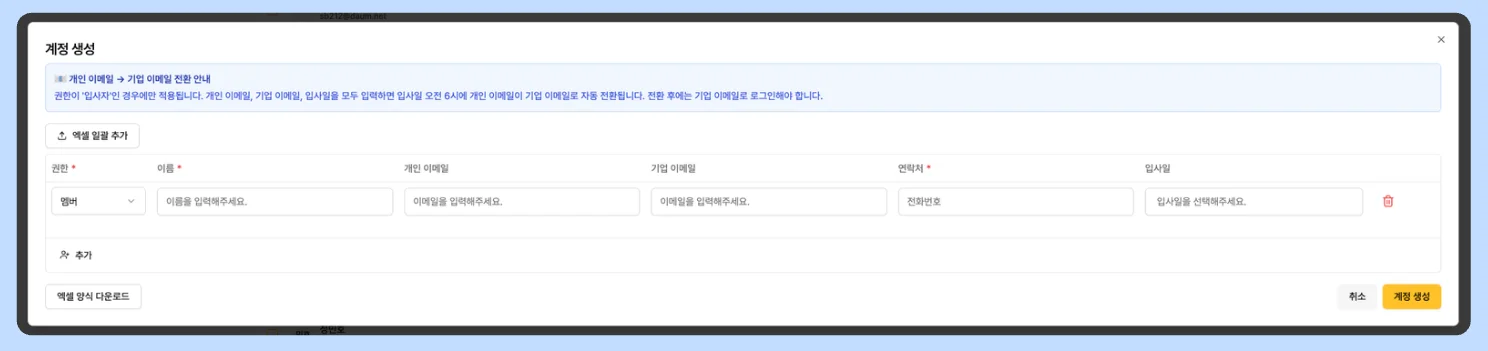 필수 입력: 해당 멤버 정보에 개인 이메일, 기업 이메일, 입사일이 모두 등록되어 있어야 합니다.