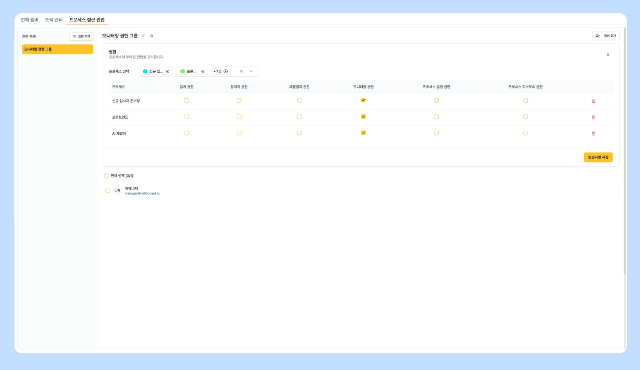 팀 규모가 커질수록 정보의 보안과 역할 분담이 중요해집니다. 이제 각 프로세스별로 멤버들의 접근 권한을 세밀하게 제어하여 최적의 협업 환경을 구축해 보세요.