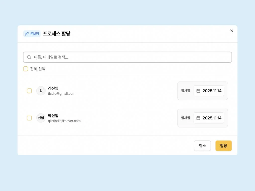온보딩 프로세스 할당 시 멤버를 스크롤로만 찾아야 했던 불편을 개선했습니다.