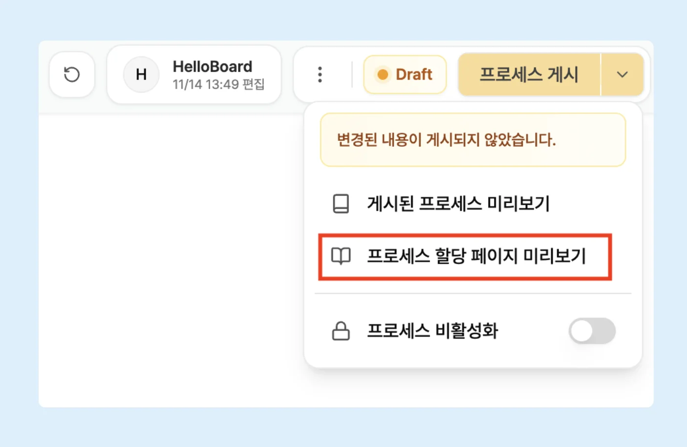 프로세스를 게시하기 전에, 프로세스 할당 페이지의 미리보기 버튼을 통해