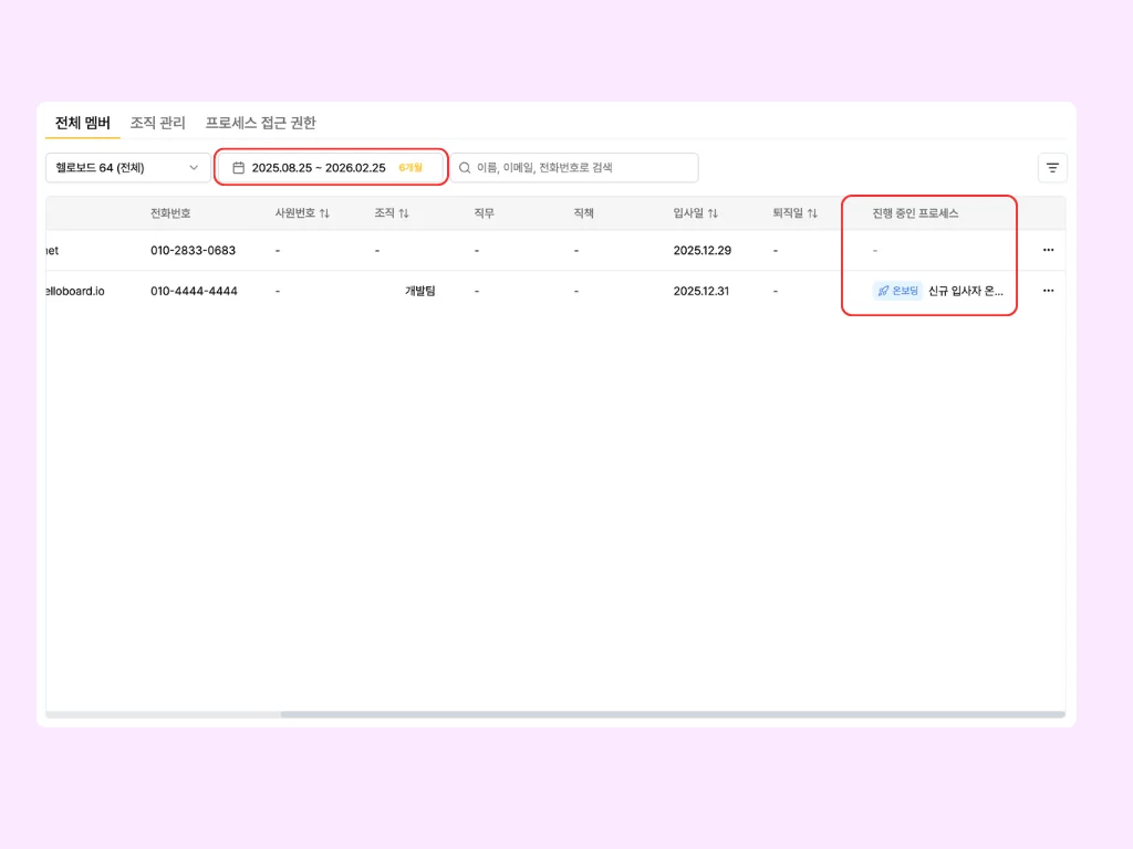 멤버 프로세스: 입사일 필터로 특정 기수를 분류하고, 진행 중인 프로세스 컬럼으로 참여 현황을 실시간 파악하세요.