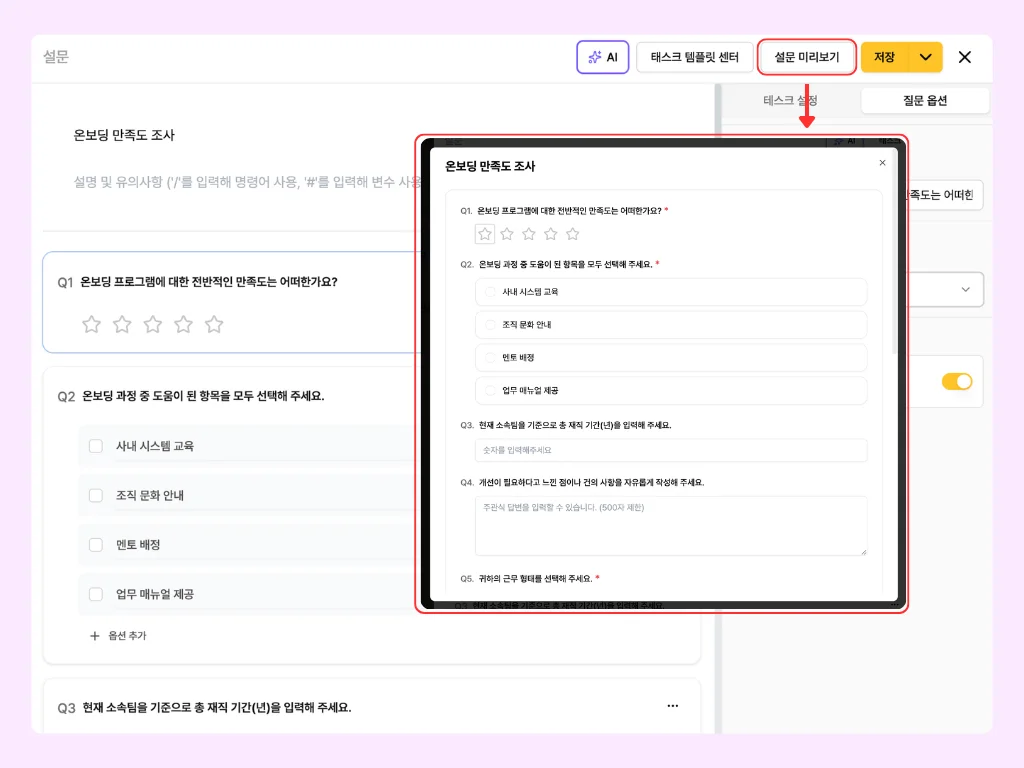 문항을 다 만드셨나요? 이제 배포 전 응답자(임직원)에게 어떻게 보일지 미리 확인하여 완벽한 피드백 환경을 구축할 수 있습니다.